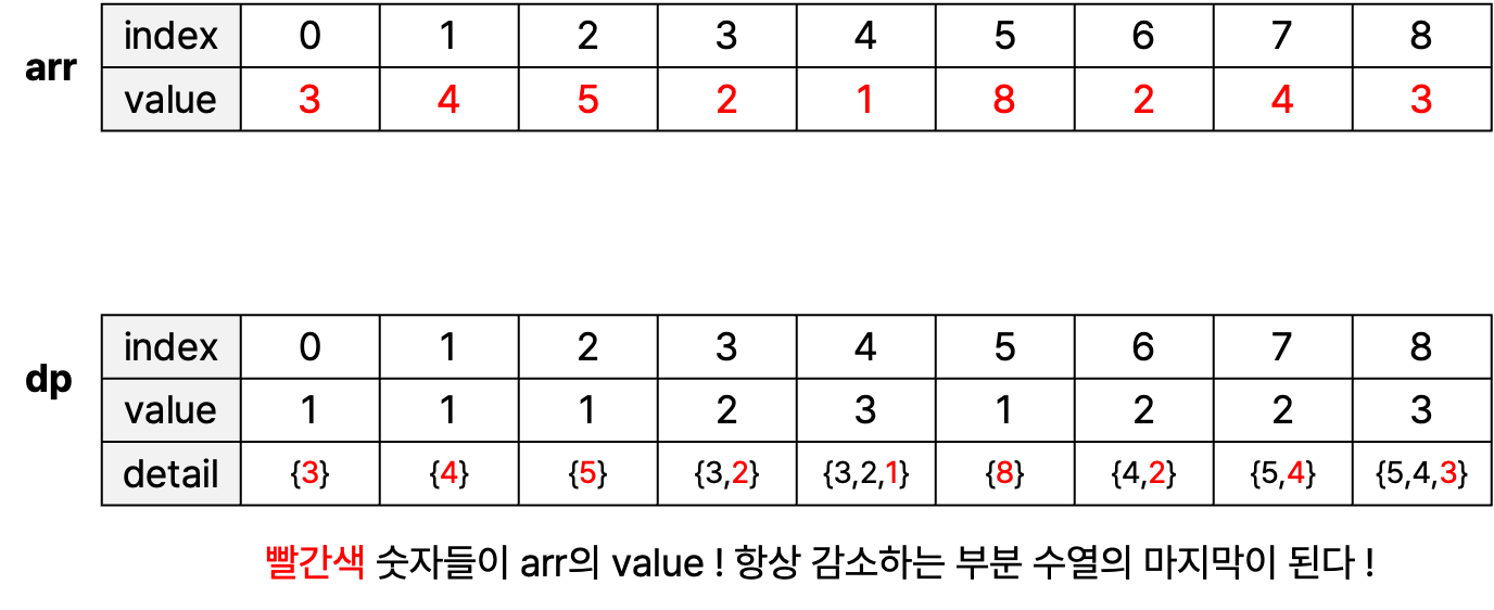 - arr[i]를 감소하는 부분 수열의 마지막 수로 하는 감소하는 부분 수열의 길이